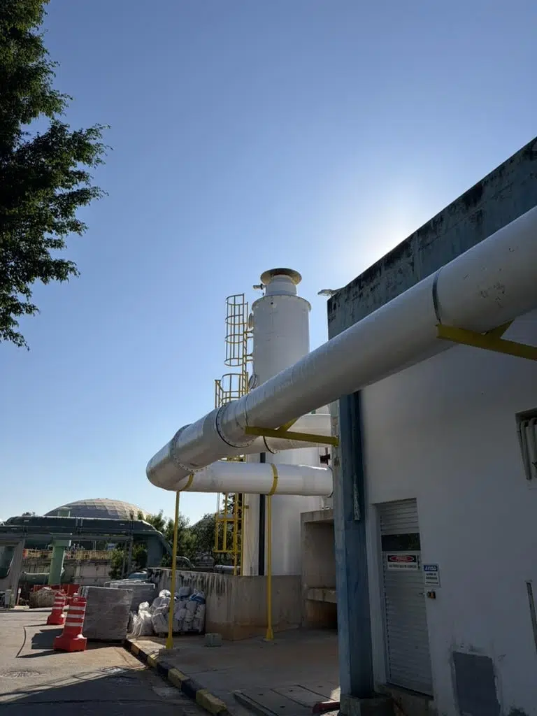 O equipamento foi dimensionado para sucção e tratamento de até 17.000 m³/h de ar contaminado, conduzindo o fluxo para uma torre de lavagem (scrubber) de alta eficiência. - Tecnologia de neutralização: